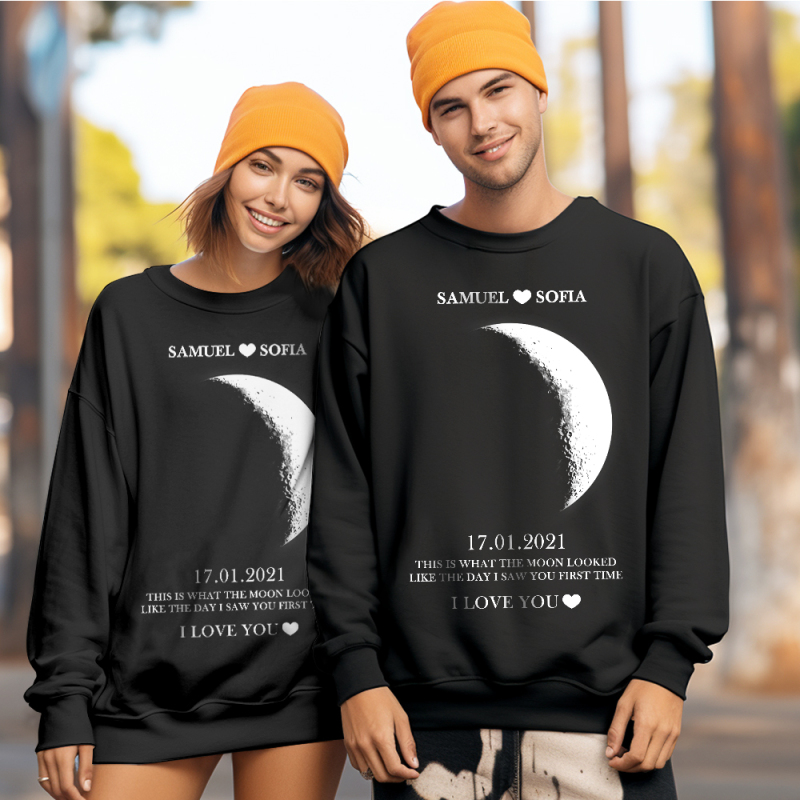 Custom Moon Phase Round Neck Unisex Sweatshirt Personalized Names Crewneck Sweatshirts Valentine's Day Gifts for Couple